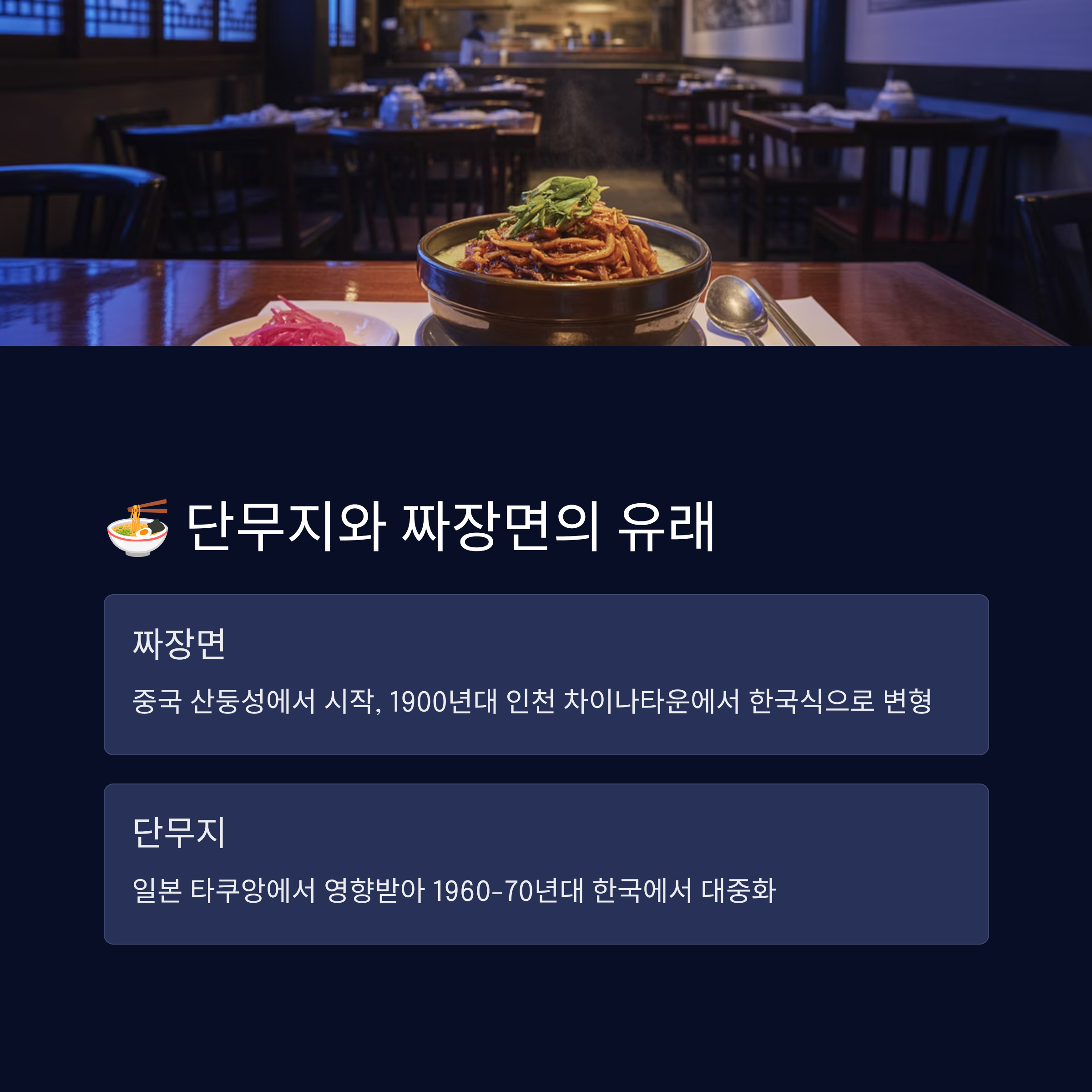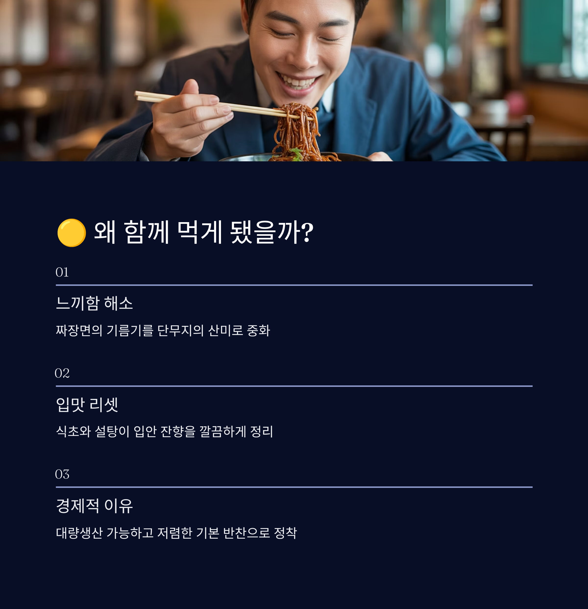이 두 음식은 별개로 시작되었지만, 짜장면의 느끼함을 단무지의 산미로 잡아주는 조합으로 정착되었어요. 지금은 중국집에서 단무지가 빠지면 섭섭할 정도로 흔한 조합이죠.