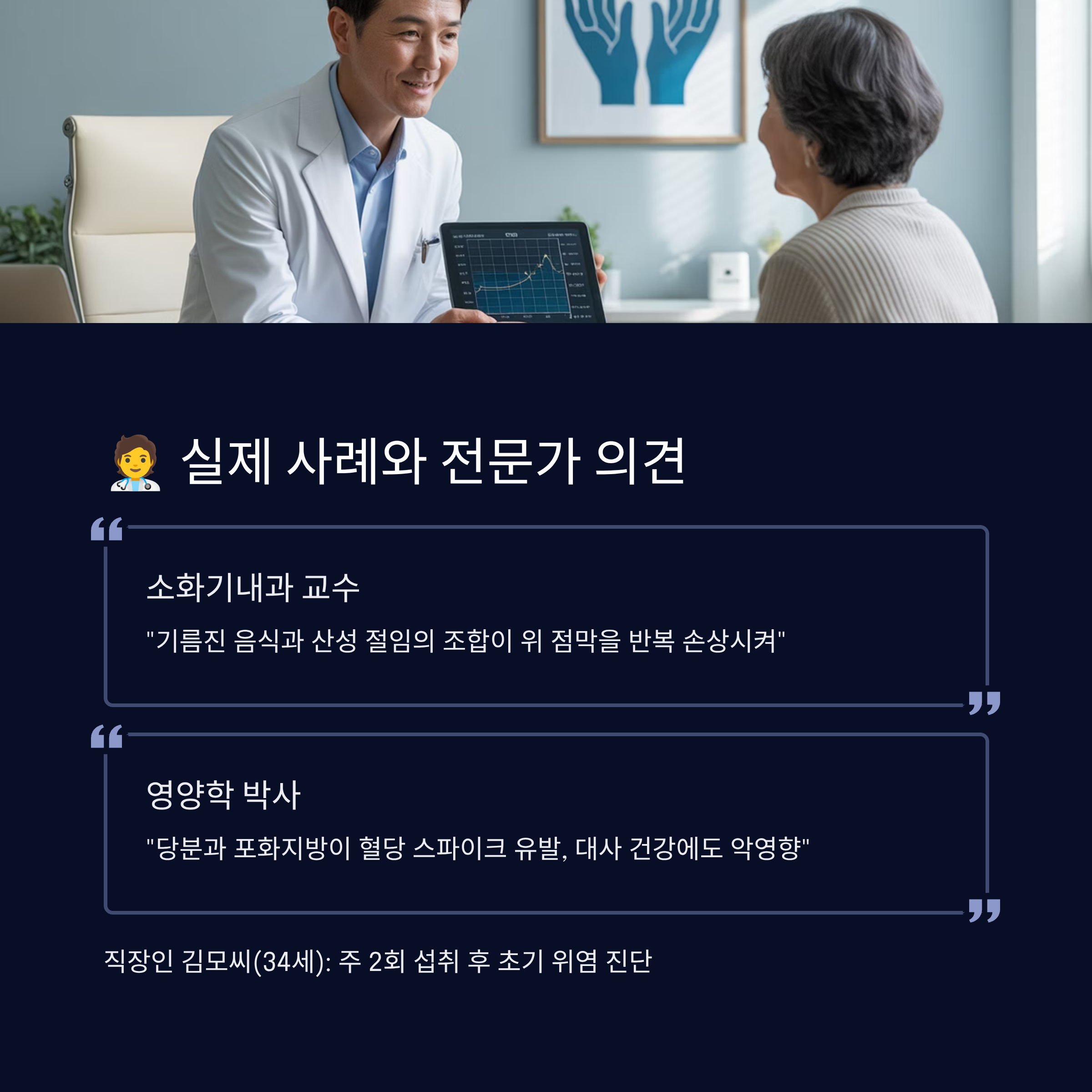 소화기내과 전문의 | 산성+기름기 조합, 위 점막 자극 | 만성 위염, 위산 역류 유발 |