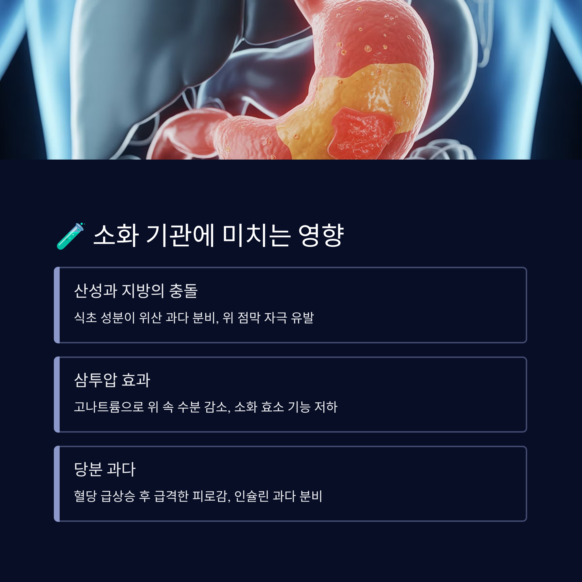 산성 자극 | 단무지 (식초) | 위산 과다 | 위염, 속쓰림 |