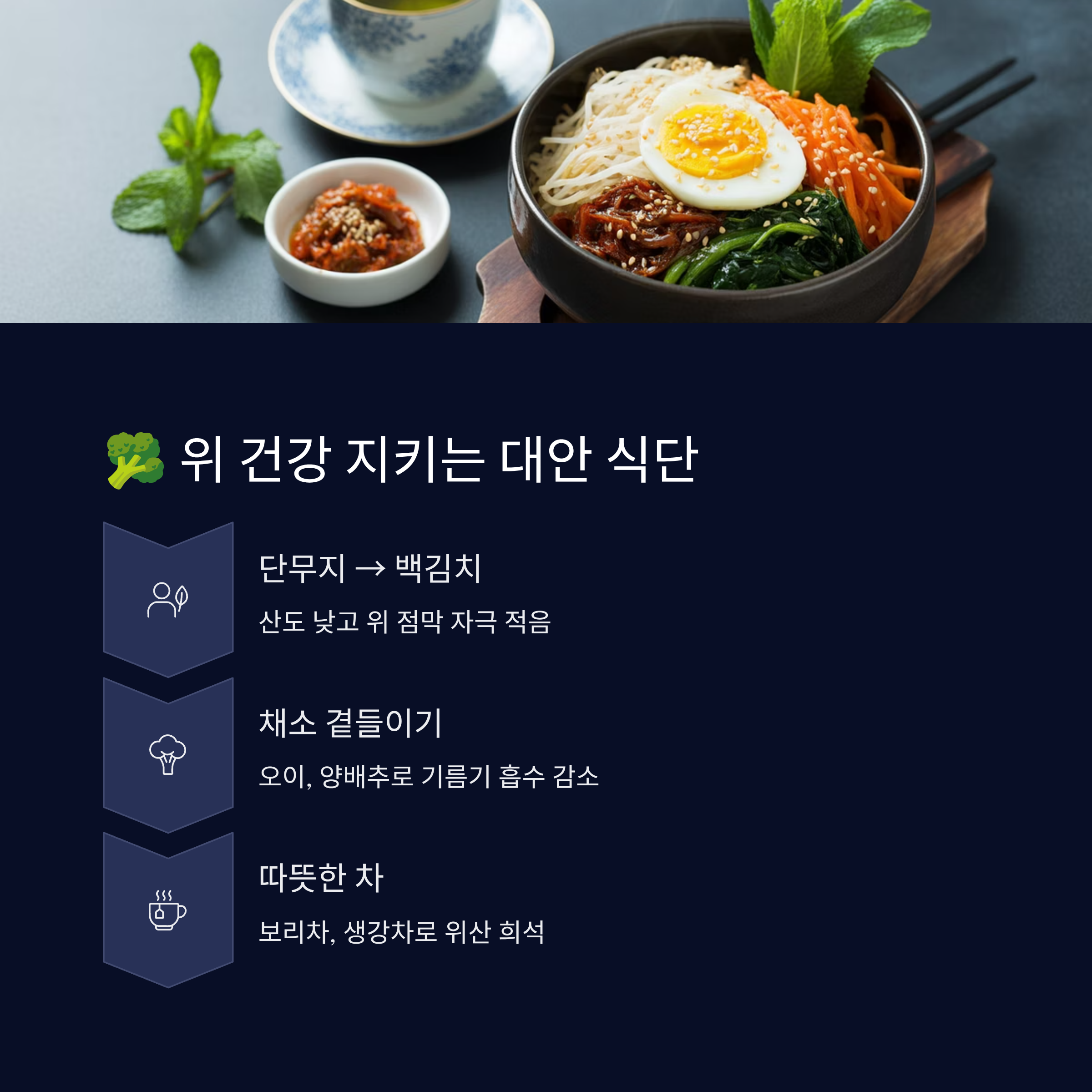 짜장면과 단무지 조합을 완전히 끊기 어렵다면, 위에 덜 부담을 주는 방식으로 조절하는 것도 방법이에요. 가장 간단한 방법은 단무지를 식초 없는 백김치나 저염 무생채로 바꾸는 거예요. 산도가 낮고, 위 점막 자극이 적은 반찬으로 대체해보세요.