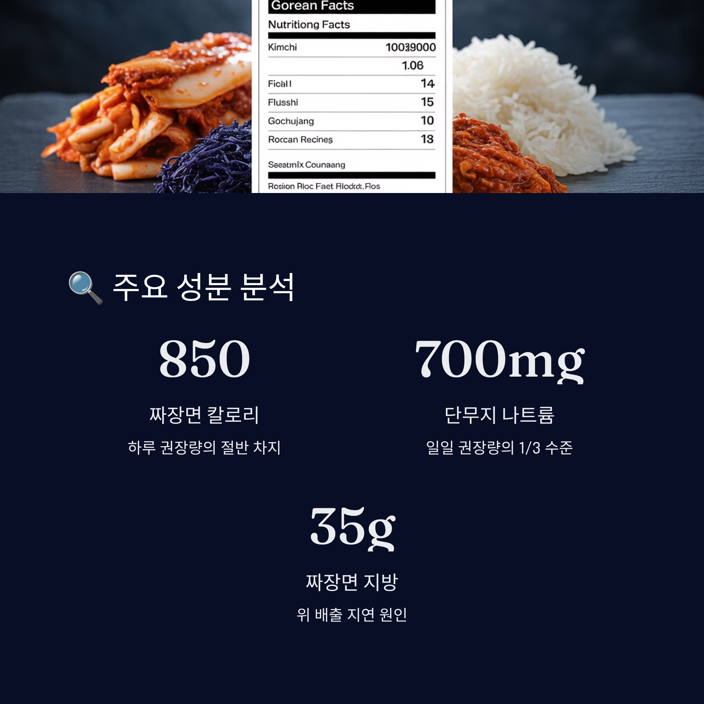 짜장면 한 그릇에 포함된 칼로리는 평균 800~1000kcal 정도로, 성인 하루 권장 칼로리의 절반 가까이를 차지해요. 여기에 기름기가 많아 소화 과정에서 위장에 부담을 주고, 위산을 많이 분비하게 만들어요.